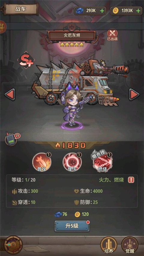 4、如下圖,一直對戰車進行升級和突破就可以提升攻擊、生命、穿透以及防御屬性了