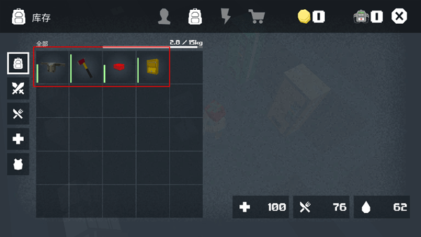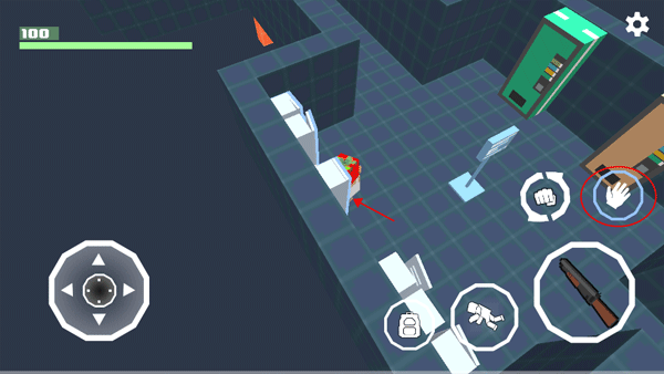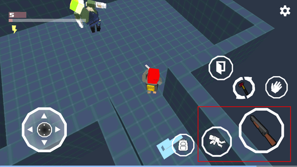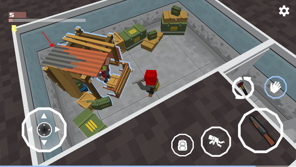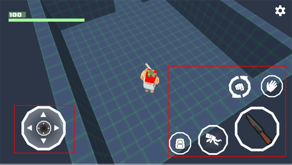 首先來介紹一下基本功能按鈕的意思和使用方式。左邊是上下左右移動方向鍵,用左手控制小人的移動方向;右邊就是主要功能鍵了,主要包含背包、躲避、射擊、出拳、以及拾取,背包就是用來裝武器、食物以及物資的;躲避就是用來躲閃敵人的攻擊;出拳和槍可以進行調換;拾取就是將箱子或敵人身上的物資拿到自己的背包里面。