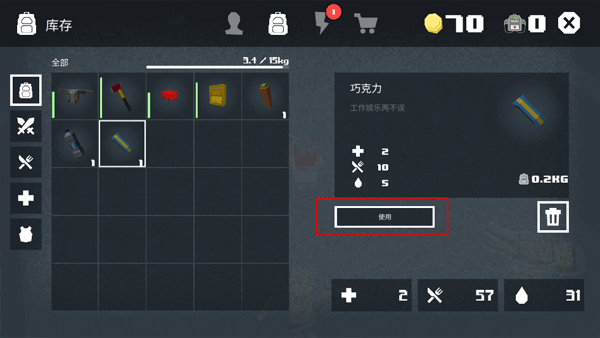 如果你的體力已經下降到非常嚴重的情況下,你可以點擊你的背包,選擇食物,點擊左邊的“食用”按鈕,就能讓你快速恢復體力,繼續戰斗。