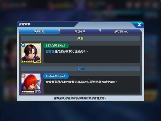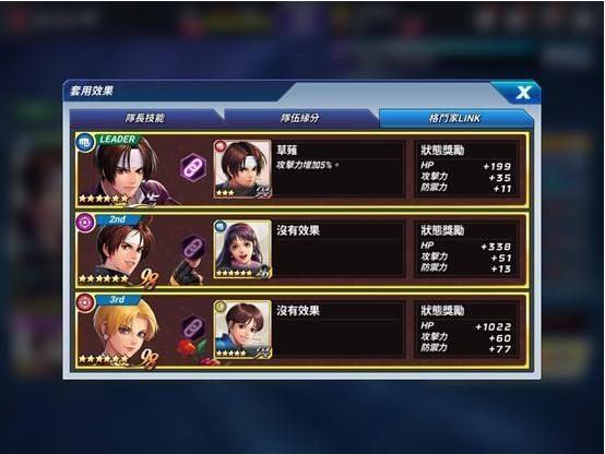而角色跟打手的LINK 羈絆效果,也是跟隊長技一樣的道理,但是「只會影響到該名角色」,通常LINK的效果都會比直接提升戰力還來得好用,像是草薙京跟草薙柴舟的LINK效果為攻擊+5%、防御+5%,或是刷金幣常用的羈絆。