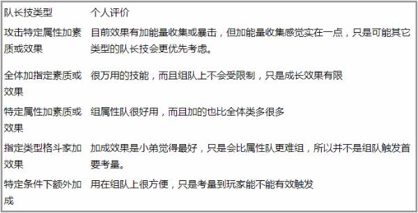 組屬性隊時有二個考量要素,分別是緣分和隊長技能考量,緣分除了加素質%數外,有些有特效,盡量以能觸發特效優先。隊長技能加成算是加不少,所以也推薦選好隊長和可以觸發的的隊員,目前小弟有的角色的隊長技分類如下表,玩家可以用這些去發想,推薦打關卡先選加攻擊類型比較實用,其它類依需求調整。組活動上是問題不大,主要還是打關卡挑戰時要看情況調整一下。需注意一點,幫手的隊長技也會計算在內,選幫手時可能不只要注意能力和方不方便連段外,他的隊長技也要考量一下。另外,有些角色的招式是會有中斷和硬直空檔,可能在挑戰打連段挑戰時換成比較好連段的角色。