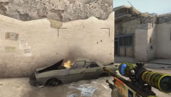 當T進攻B點斷后的時候,站這里比貼墻好的原因是因為地圖的改動,香蕉道門口兩邊都可以站人,此時如果對手稍有頭腦就會先看右邊(圖中準星瞄準的地方)再來檢查左邊,此時你完全可以提前半個身位知道他的動向。