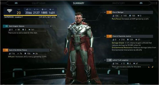 游戲中有成百上千種物品可以獲取,每項物品的影響能力也不同。除了對角色屬性的影響外,還有一些稀有裝備有一些特殊效果,比如 新的視覺特效,或者增加每場戰斗中獲得金幣數量等。如果能夠收集到完整的一整套裝備,還會得到額外的增益,比如增加蝙蝠俠蝙蝠鏢的射程。