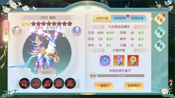 坐騎每升一階提升1%升星屬性,使用坐騎馭魂丹可增加屬性,使用一定數量后可提升品階。