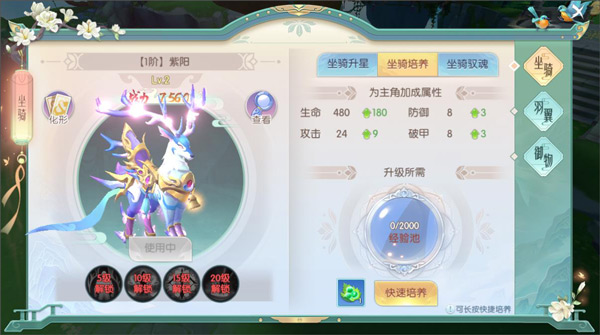 快速培養坐騎,可提升生命力、防御力、攻擊力和破甲能力。