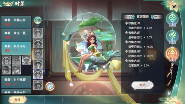 玩家在游戲中可收集套裝碎片,收集套裝達成一件,攻擊百分比增加5%,玩家收集完成后可激活套裝,增加玩家角色屬性和實力。
