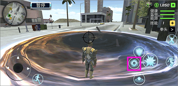 3、按下紫色方框內的按鈕是向地面發射一個黑洞,短時間內可以吞噬部分物體;