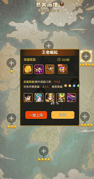 每個派遣任務同時還擁有額外獎勵當派遣所需英雄屬性達到要求時,即可增加額外獲得獎勵的幾率額外寶箱可以獲得大量稀有材料和珍惜道具哦~同時要是運氣不佳,可點擊右下角的刷新,把高級別的派遣刷新出來哦~