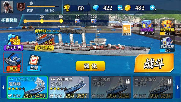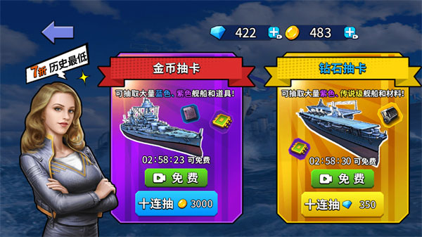 2、戰(zhàn)艦需要通過抽卡來獲得;