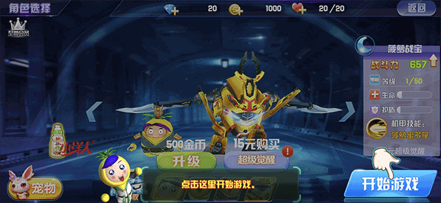 多款令人眼花繚亂的戰機酷炫來襲,菠蘿帥帥、小果萌萌、香橙酷酷等多樣戰甲讓你目不暇接,所有戰甲都有自己的專屬技能。快進入游戲選擇你心愛的戰機,體驗酣暢淋漓的關卡吧!5款機甲還可以合體為果寶戰神,迎戰最強敵人保衛水果世界;