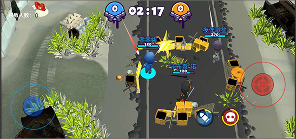 2、點擊右邊的搖桿進行射擊,自動瞄準最近的敵人并標記為紅色。