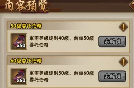 解鎖委托任務(wù)后快速將軍團升到十級來解鎖更高級委托任務(wù),武將二十級后去鍛冶屋打造全套三階裝備能穿很久,后面也可消耗材料進行升階,材料不夠的朋友可以選擇材料特惠包,也可穿委托任務(wù)裝備來進行過渡,相對會卡一段時間關(guān)卡。鍛冶屋的三階武器裝備