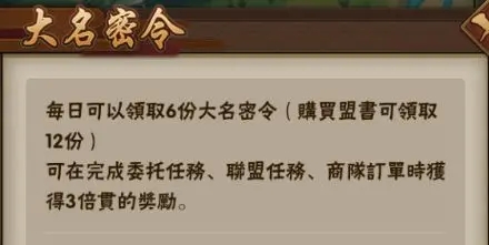 大名密令每天記得刷到上限之內(nèi),不然每天的免費密令領(lǐng)不了,勾選大名密令使用調(diào)遣軍令快速完成高等級委托是前期升級大頭,搭配盟書,武士薪俸,常勝戰(zhàn)旗特權(quán)使用能夠達到收益最大化,是日常游玩的一大助力。