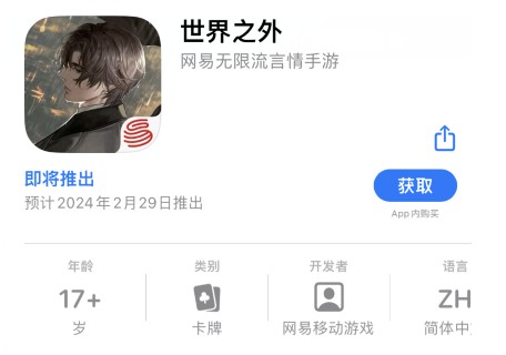 網(wǎng)易推出的首款無限流言情手游《世界之外》現(xiàn)已開啟IOS預(yù)訂,占位符顯示的上線時(shí)間是2月29日。