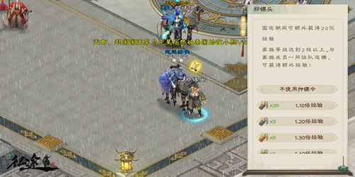 處。完成運鏢后,可獲得大量經驗、功勛、家族貢獻度、活躍度和家族資金,鏢車品質越高獲得的經驗和功勛越高。