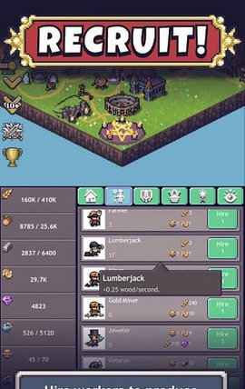 3、此時,在村莊通過雇傭伐木工、鐵匠等等人物,會為你的英雄提供后援力量。