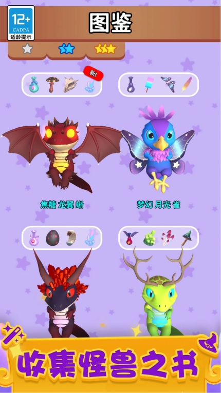 點擊怪物并進行拖動,使其與其他怪物合成。這里有未知的怪物,也有各式各樣的怪物。僅需簡單的合成操作,就能創造出新怪物。給你最喜愛的怪物投喂新鮮的肉,以此提升你的等級。