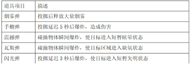 大家雖然可以在商店中購買道具,但對萌新來說太“奢侈”了。所以還是在地圖中的投擲物品箱和敵人手中繳獲比較好。這里最推薦的是紫色震撼彈,可以讓敵人被控幾秒,不論是進攻還是跑路都非常好用。至于其他投擲類道具,各位螢火蟲可以參照下面的表格,按喜好搭配。