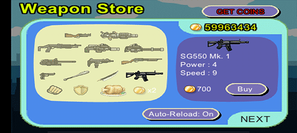 5、游戲還加插了角色升級及選擇不同武器的系統,可以利用過關賺取的金錢來選購不同的武器,對付下一關卡中的敵人