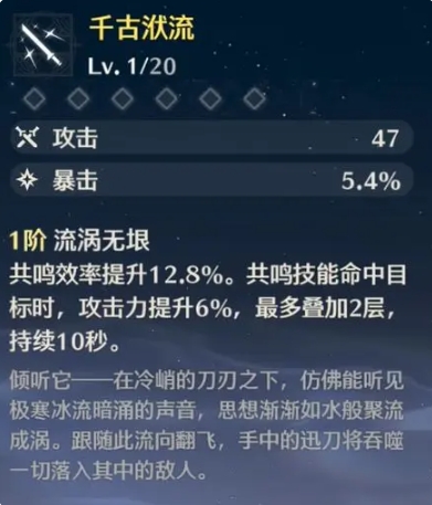 主詞條加攻擊,副詞條加暴擊百分比,效果是共鳴效率提升12.8%,小技能命中后攻擊提升6%,最多疊加2層。迅刀角色缺攻擊暴擊可以選擇這把武器。