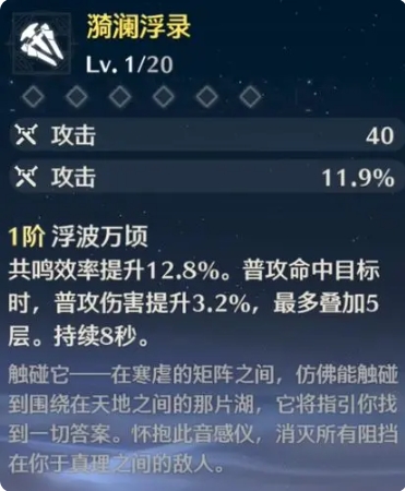 主詞條加攻擊,副詞條加攻擊百分比,效果是共鳴效率提升12.8%,普攻命中提升3.2%的傷害,最多疊加5層。音感儀角色缺攻擊力還有普攻傷害可以選這把武器。