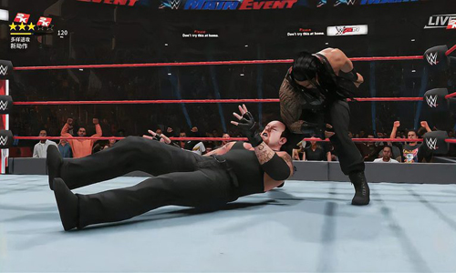 按WASD+→把敵人拉過去使其躺在解說臺,出現OMG提示后按↑,需要一個以上F(如果有F但是沒有出現OMG提示可能是體力不夠或者沒有那個技能,Play模式請到招式設置里把所有技能全部打鉤,生涯模式貌似需要購買)