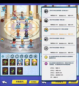 我方上陣5名英雄,根據上陣角色的元素屬性存在增益的加成,同元素陣營英雄越多屬性加成越強力。此外還有光與暗兩種元素較為特殊,其中光元素可視為暗元素以外任意元素陣營填充增益光環,暗元素陣營則是有相對獨立的屬性加成。