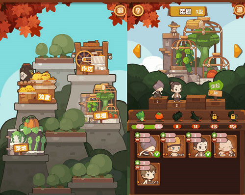 經營一家飯店,沒有食材怎么行?《爆炒江湖》游戲中,也需要玩家去探索食材,這也是主線任務之一。在自己的“后花園”里,有菜棚、雞舍、作坊等,在里面玩家可能派出廚師去探索菜品(白菜、西紅柿、雞蛋等),然后用收獲的菜品為客人做菜。