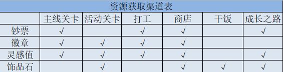 這四類資源的獲取渠道有很大的重疊部分,在前期的新手階段,成長之路是獲取資源的重要渠道之一,成功通關規定章節或者達到目標戰力,就可以同時獲得大量鈔票、靈感值和飾品石。在后期通關主線關卡是獲得大量鈔票、靈感值以及徽章的主要來源,而打工是同時獲得鈔票和徽章的次要來源。
