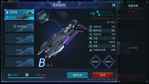 在圖示界面中可以添加艦船,裝備核心,點(diǎn)擊艦船倉(cāng)庫(kù)按鈕可以對(duì)艦船進(jìn)行其他操作(升級(jí)、換武器等等)
