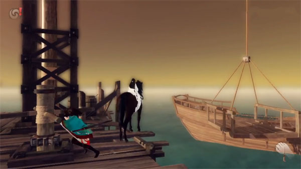 (小船并不靠岸需要主角將小璃和馬想辦法運送到船上)我們可以騎馬上到木臺子上面,此時就可以觸發動畫。