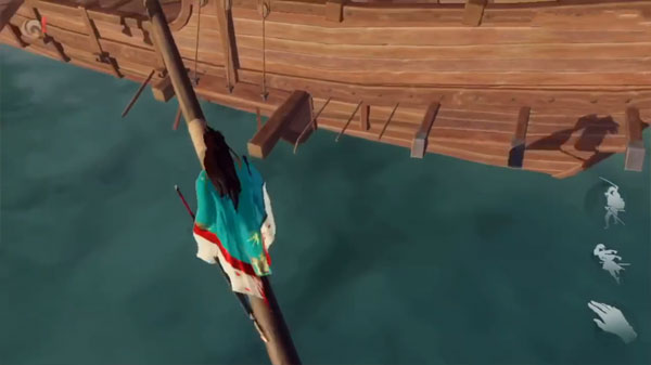 主角來到側面,踢到船桿,主角可以沿著船桿走到小船上,主角將小璃和馬從木板上帶到小船中,這里一定要注意,機關一定要推到頭,不然主角和小璃會調到河里。