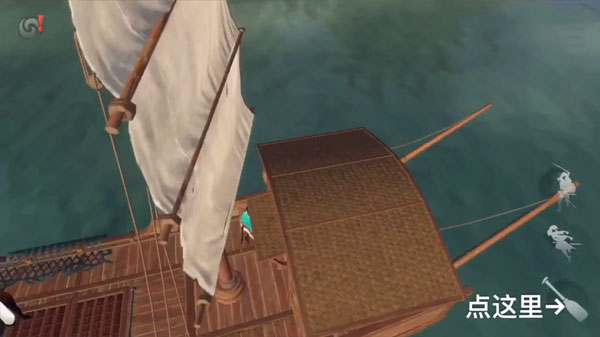 主角來到船尾,就可以看見圖標變成一個船槳,點擊就可以開啟小船,左手前推小船前進,右手則可以控制小船的視野視角。