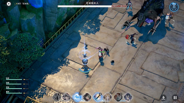4、例如在一場boss戰中,boss會交替施放多種技能來攻擊玩家,有扇形技能,有召喚小嘍啰的技能,有時還會暫時脫離戰斗,在場邊釋放范圍技能來攻擊玩家的小隊,而根據角色定位不同,也有在boss面前抵擋傷害,拉住仇恨,還有在側面輸出的近戰輸出,以及在后方的輔助和遠程輸出,總共可以帶到四名角色上陣。