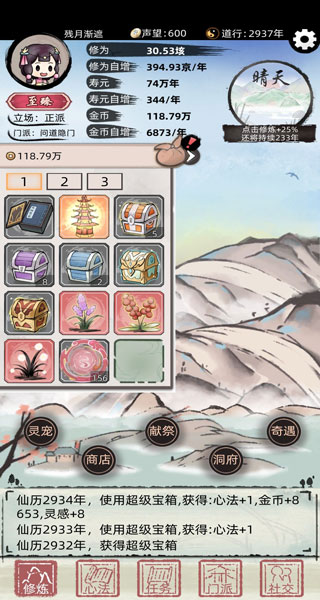 也可以接任務和商店 宗門買超級 至高寶箱開正道高金錢加成的紅橙替換低品質功法。(需要先按攻略2接正道任務箱子)