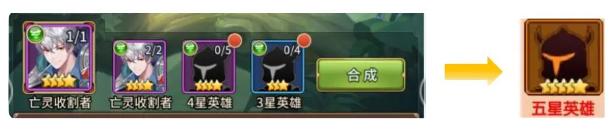 4星升到5星需要3個本體+5個同系的4星+4個同系的3星,圖片里顯示的為3個風系4星亡靈收割者加上4個風系4星英雄+4個風系3星英雄,最終合成為5星的亡靈收割者。我們把想升星的英雄稱為本體,合成用的英雄稱為狗糧或者糧食。5星往上,還可以合成6星。