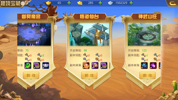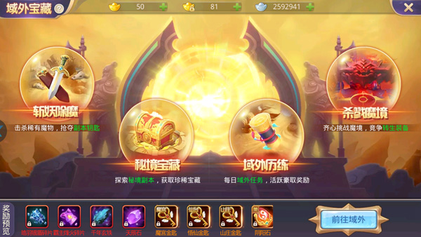 1、域外寶藏地圖內包含數個秘境副本(幽冥魔宮、悟道仙臺、神武山莊),挑戰成功可獲得豐厚獎勵。