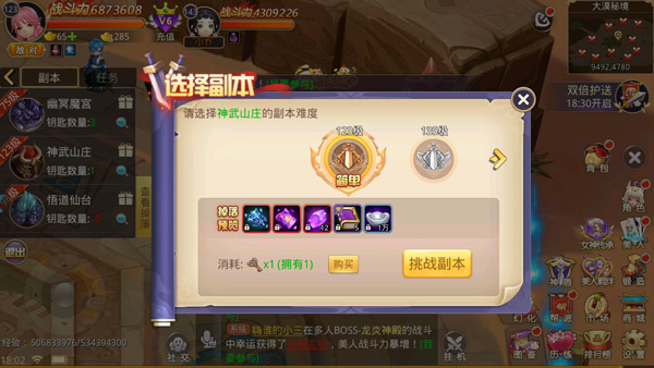 1)試煉副本:試煉副本每天可挑戰3次,獲得海量角色經驗和美人經驗;每次挑戰時間5分鐘,進入副本完全擊殺一波怪物后自動下一波,如此循環直至5分鐘結束;副本中使用經驗符能大幅度提高獲得經驗,最高加成150%;副本中途退出,本次挑戰耗時保留,今天內重新進入耗時繼續。每天24:00重置副本次數和挑戰時間。