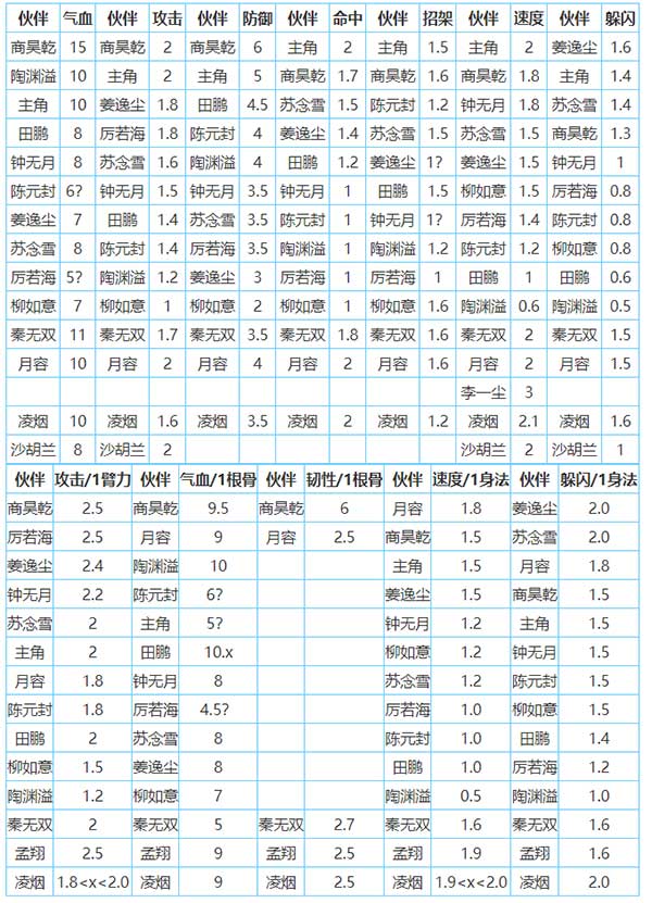 伙伴從上到下為優(yōu)→劣!表格里的數(shù)值皆為不溢出加點時!每加1點增加的相應(yīng)屬性值!