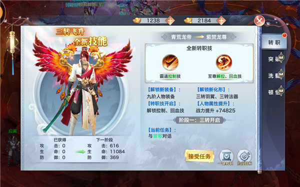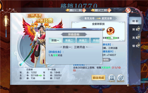 屬性的提高:完成了每一階段的轉職任務后,角色都能夠獲得攻擊、生命、防御基礎三維屬性的巨幅提升。