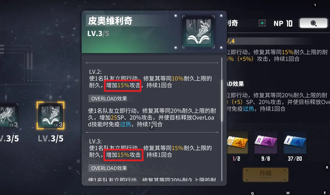 4、技能:看看數據,提高倍率的常用技能都點到3,4級目前不氪金幾乎點不起。像颶風2消buff,熒2只加行動優先度低些。還有就是注意看技能面板的放大鏡,比如烏琳3技能,2級+15攻擊,3級還是+15攻擊,所以3級優先級不大。而琶音3技能,1、2級都只+10傷害,而3級+15傷害,所以要點就點3級。