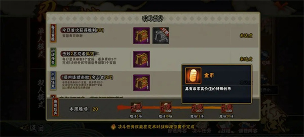 2.關(guān)于周勝,周勝指的是決斗場(chǎng)勝利的次數(shù)(并不是贏的越多越好),周勝一般是每周在決斗場(chǎng)勝利20把對(duì)戰(zhàn)獲取的獎(jiǎng)勵(lì)(如果是假日周6到周日的話贏一把算贏了兩把),每周的周勝是600金幣(注意周勝是每一周刷新的而不是每一天刷新的)這邊建議如果不肝每日或者比較忙沒時(shí)間肝每日的可以每周把周勝清一下