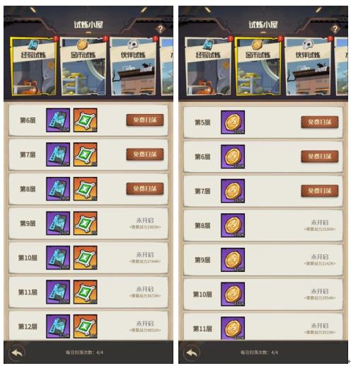 試煉小屋一共有四種試煉,分別為經驗試煉、金幣試煉、伙伴試煉以及水晶試煉。每一層完成挑戰之后才會開啟下一層的挑戰。每種試煉每天都有一次免費掃蕩次數,1次鉆石掃蕩次數,可以通過提升特權等級來獲得額外掃蕩次數,掃蕩次數會在每天早上5點進行刷新。每達到新的一層所需要的戰力就能開啟挑戰,挑戰試煉層數不會消耗次數,掃蕩才會消耗次數。所以這里推薦的是每天把自己戰力提升完后,能達到自身戰力提高到最高開啟的層數再去掃蕩會獲得最多的材料獲取。