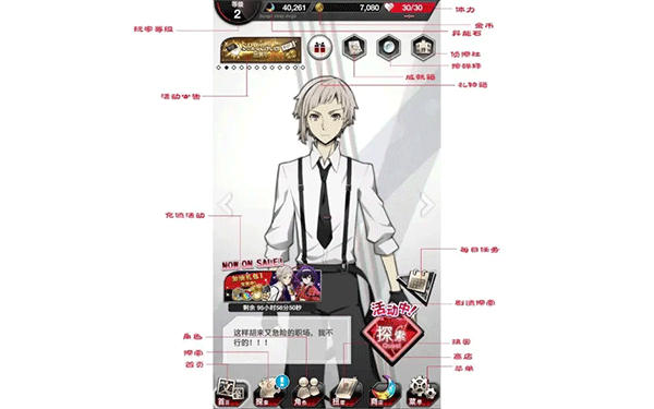 9、偵探社:在偵探社里每隔一段時間可以從對應(yīng)角色處領(lǐng)取獎勵,可用素材或異能石強(qiáng)化偵探社內(nèi)的角色工作環(huán)境,以縮短等待時間及提高獎勵等級。