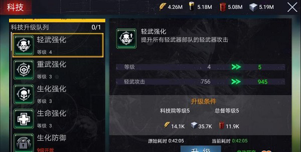 俗話說科技是第一生產力,這句話在游戲里同樣體現地淋漓盡致!我們可以研究升級各種科技,來強化我們的生命,防御,武器之類的各種屬性,并且還可以減少升級基地所耗費的資源與時間,建議科技解鎖之后就立刻去研究,要在比較短的時間內升起來,這對你后面的發展會有很大的幫助!