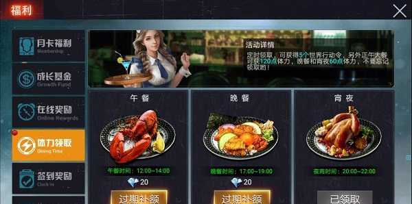 然后每天還可以領三次體力,同樣也可以購買,如果忘記領了也沒事,只需要20鉆就可以補領了~每天的超值搶購如果有錢的話也可以買下,因為里面的東西其實確實不錯,另外如果是想長期玩下去地話,成長基金和月卡是必須的,至于VIP等級沒有必要太在意,因為不僅每天登錄會送VIP經驗,活躍寶箱也會送,所以不必太過在意。