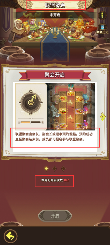 聯盟會長、副會長或理事預約發起聯盟聚餐,聯盟內成員報名后即可參與聯盟聚會,擺放的佳肴越豐盛,聚會檔次越高,可獲得的聚會獎勵也越好。