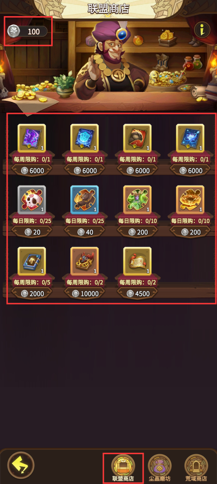 聯盟成員可在聯盟商店使用聯盟幣或鉆石兌換商品;聯盟商店商品每日隨機刷新,聯盟等級越高,每日隨機出的商品價值量就越高。