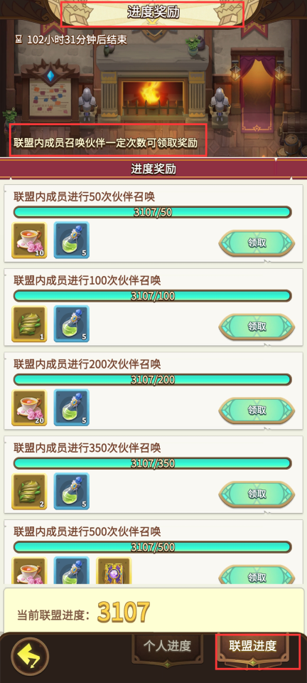在某些運營活動,比如伙伴召喚,在這一活動期間,玩家可以累計自己的“個人進度”條,獲得進度獎勵,還可以領取聯盟內成員召喚伙伴到一定次數的“聯盟進度”獎勵,活動活動材料等物品。