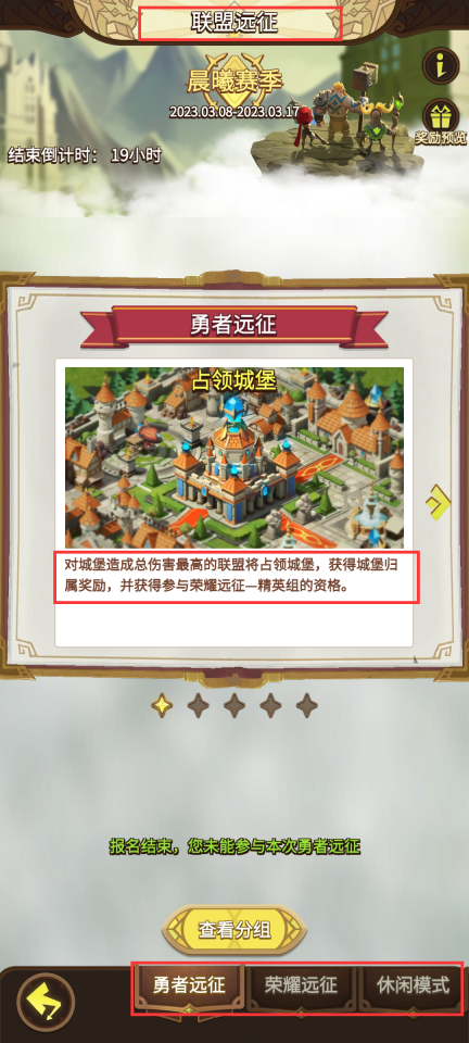錯過報名的玩家也不用擔心,可以在【聯盟遠征-休閑模式】中和其他人組成臨時聯盟參與進去,除了無法上排行榜和爭奪城堡外,該玩法對于休閑玩家來說沒有太大區別。